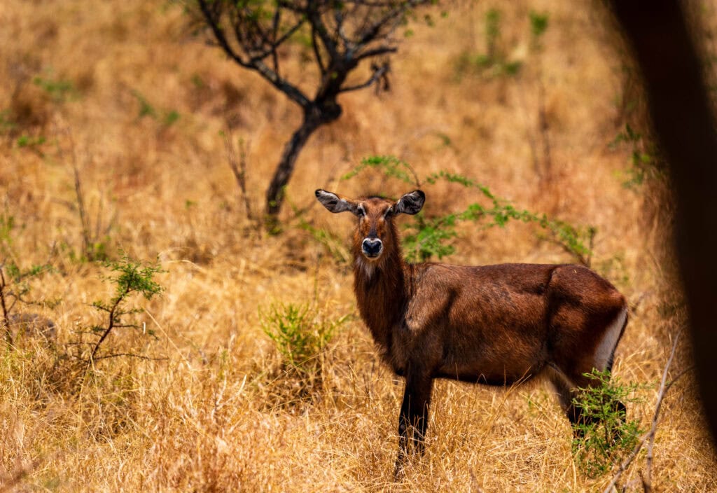 While we saw animals, it was also a bit barren. I kept wondering where they hid everything. Once we came down the hill and neared Lake Ihema, we spotted our first hippos. There were more than 15 in the water, mostly at eye level. However, there was a lone one on land. We wondered whether he had been put in time-out by the rest of the crew. And then a Waterbuck. They look like a large Impala.