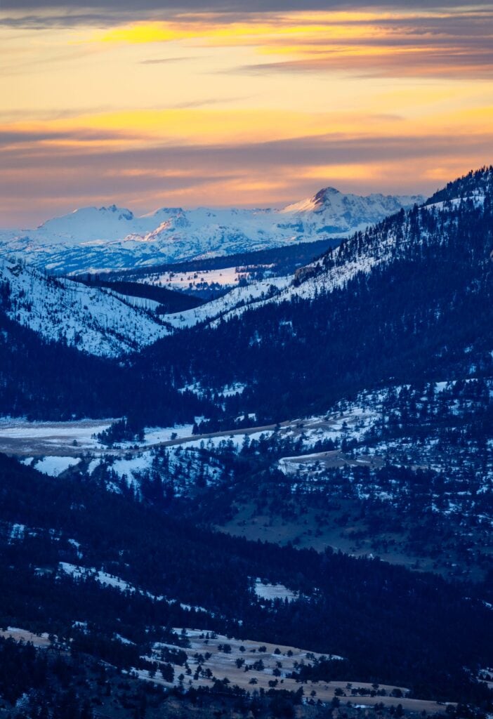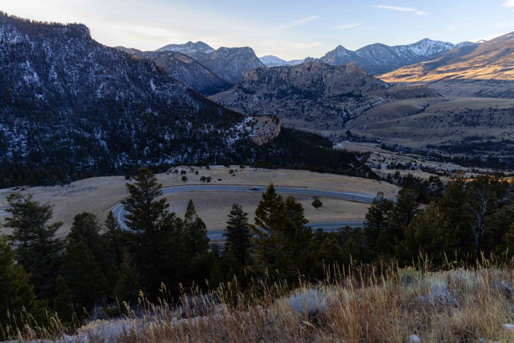 It was ridiculously beautiful. (Thankfully, there’s a pull off.) From here, you have gorgeous peaks and a massive valley below. I continued driving for another 45 minutes through the stunning Sunlight Basin and along the Clarks Fork of the Yellowstone River. (I’d realize 36 hours later that this was also the route we’d take to go ice climbing.)